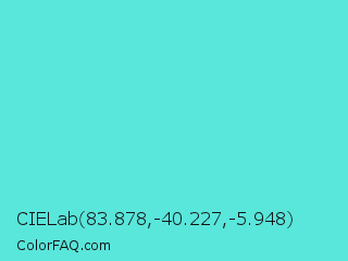 CIELab 83.878,-40.227,-5.948 Color is a light cyan color and the nearest color is Turquoise Blue #6cdae7. Hex code #59e6db and RGB value is rgb(89,230,219). In RGB color space, this color is composed of 35% red, 90% green, 86% blue, In CMYK color space, this color is composed of 61% cyan, 0% magenta, 5% yellow , 10% black , In HSL color space, this color has a hue angle of 175° , 74% saturation and 63% lightness.