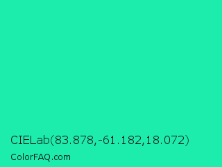 CIELab 83.878,-61.182,18.072 Color is a normal green color and the nearest color is Medium Spring Green #00fa9a. Hex code #1cedad and RGB value is rgb(28,237,173). In RGB color space, this color is composed of 11% red, 93% green, 68% blue, In CMYK color space, this color is composed of 88% cyan, 0% magenta, 27% yellow , 7% black , In HSL color space, this color has a hue angle of 162° , 85% saturation and 52% lightness.