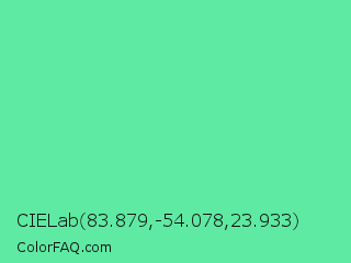 CIELab 83.879,-54.078,23.933 Color is a light green color and the nearest color is Medium Aquamarine #66ddaa. Hex code #5eeaa2 and RGB value is rgb(94,234,162). In RGB color space, this color is composed of 37% red, 92% green, 64% blue, In CMYK color space, this color is composed of 60% cyan, 0% magenta, 31% yellow , 8% black , In HSL color space, this color has a hue angle of 149° , 77% saturation and 64% lightness.