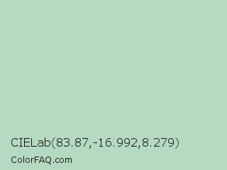 CIELab 83.87,-16.992,8.279 Color is a light green color and the nearest color is Surf #bbd7c1. Hex code #b5dac1 and RGB value is rgb(181,218,193). In RGB color space, this color is composed of 71% red, 85% green, 76% blue, In CMYK color space, this color is composed of 17% cyan, 0% magenta, 11% yellow , 15% black , In HSL color space, this color has a hue angle of 139° , 33% saturation and 78% lightness.