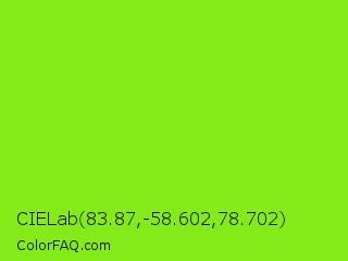 CIELab 83.87,-58.602,78.702 Color is a normal green color and the nearest color is Alien Armpit #84de02. Hex code #84ea18 and RGB value is rgb(132,234,24). In RGB color space, this color is composed of 52% red, 92% green, 9% blue, In CMYK color space, this color is composed of 44% cyan, 0% magenta, 90% yellow , 8% black , In HSL color space, this color has a hue angle of 89° , 83% saturation and 51% lightness.
