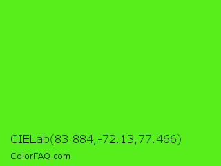 CIELab 83.884,-72.13,77.466 Color is a normal green color and the nearest color is Chlorophyll Green #4aff00. Hex code #57ef1c and RGB value is rgb(87,239,28). In RGB color space, this color is composed of 34% red, 94% green, 11% blue, In CMYK color space, this color is composed of 64% cyan, 0% magenta, 88% yellow , 6% black , In HSL color space, this color has a hue angle of 103° , 87% saturation and 52% lightness.