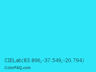 CIELab 83.896,-37.549,-20.794 Color is a normal cyan color and the nearest color is Loeen #15f2fd. Hex code #2de6f7 and RGB value is rgb(45,230,247). In RGB color space, this color is composed of 18% red, 90% green, 97% blue, In CMYK color space, this color is composed of 82% cyan, 7% magenta, 0% yellow , 3% black , In HSL color space, this color has a hue angle of 185° , 93% saturation and 57% lightness.