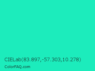 CIELab 83.897,-57.303,10.278 Color is a normal cyan color and the nearest color is Turquoise PWG #30d5c8. Hex code #1cecbc and RGB value is rgb(28,236,188). In RGB color space, this color is composed of 11% red, 93% green, 74% blue, In CMYK color space, this color is composed of 88% cyan, 0% magenta, 20% yellow , 7% black , In HSL color space, this color has a hue angle of 166° , 85% saturation and 52% lightness.