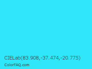 CIELab 83.908,-37.474,-20.775 Color is a normal cyan color and the nearest color is Loeen #15f2fd. Hex code #2ee6f7 and RGB value is rgb(46,230,247). In RGB color space, this color is composed of 18% red, 90% green, 97% blue, In CMYK color space, this color is composed of 81% cyan, 7% magenta, 0% yellow , 3% black , In HSL color space, this color has a hue angle of 185° , 93% saturation and 57% lightness.