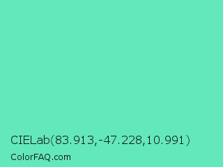 CIELab 83.913,-47.228,10.991 Color is a light green color and the nearest color is Medium Aquamarine #66ddaa. Hex code #62e8bb and RGB value is rgb(98,232,187). In RGB color space, this color is composed of 38% red, 91% green, 73% blue, In CMYK color space, this color is composed of 58% cyan, 0% magenta, 19% yellow , 9% black , In HSL color space, this color has a hue angle of 160° , 74% saturation and 65% lightness.