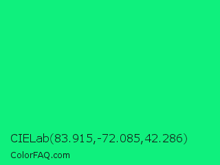 CIELab 83.915,-72.085,42.286 Color is a normal green color and the nearest color is Spring Green #00ff7f. Hex code #0ff07d and RGB value is rgb(15,240,125). In RGB color space, this color is composed of 6% red, 94% green, 49% blue, In CMYK color space, this color is composed of 94% cyan, 0% magenta, 48% yellow , 6% black , In HSL color space, this color has a hue angle of 149° , 88% saturation and 50% lightness.