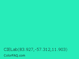 CIELab 83.927,-57.312,11.903 Color is a normal cyan color and the nearest color is Turquoise PWG #30d5c8. Hex code #27ecb9 and RGB value is rgb(39,236,185). In RGB color space, this color is composed of 15% red, 93% green, 73% blue, In CMYK color space, this color is composed of 83% cyan, 0% magenta, 22% yellow , 7% black , In HSL color space, this color has a hue angle of 164° , 84% saturation and 54% lightness.