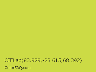 CIELab 83.929,-23.615,68.392 Color is a normal yellow color and the nearest color is Wattle #dcd747. Hex code #ccdb45 and RGB value is rgb(204,219,69). In RGB color space, this color is composed of 80% red, 86% green, 27% blue, In CMYK color space, this color is composed of 7% cyan, 0% magenta, 68% yellow , 14% black , In HSL color space, this color has a hue angle of 66° , 68% saturation and 56% lightness.