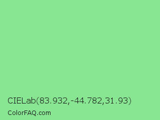 CIELab 83.932,-44.782,31.93 Color is a light green color and the nearest color is Light Green #90ee90. Hex code #88e693 and RGB value is rgb(136,230,147). In RGB color space, this color is composed of 53% red, 90% green, 58% blue, In CMYK color space, this color is composed of 41% cyan, 0% magenta, 36% yellow , 10% black , In HSL color space, this color has a hue angle of 127° , 65% saturation and 72% lightness.