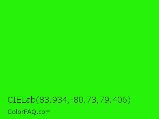 CIELab 83.934,-80.73,79.406 Color is a normal green color and the nearest color is Neon Green #39ff14. Hex code #26f20a and RGB value is rgb(38,242,10). In RGB color space, this color is composed of 15% red, 95% green, 4% blue, In CMYK color space, this color is composed of 84% cyan, 0% magenta, 96% yellow , 5% black , In HSL color space, this color has a hue angle of 113° , 92% saturation and 49% lightness.