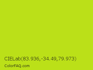 CIELab 83.936,-34.49,79.973 Color is a normal lime color and the nearest color is Fuego #bede0d. Hex code #bbe018 and RGB value is rgb(187,224,24). In RGB color space, this color is composed of 73% red, 88% green, 9% blue, In CMYK color space, this color is composed of 17% cyan, 0% magenta, 89% yellow , 12% black , In HSL color space, this color has a hue angle of 71° , 81% saturation and 49% lightness.