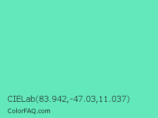 CIELab 83.942,-47.03,11.037 Color is a light green color and the nearest color is Medium Aquamarine #66ddaa. Hex code #63e8bb and RGB value is rgb(99,232,187). In RGB color space, this color is composed of 39% red, 91% green, 73% blue, In CMYK color space, this color is composed of 57% cyan, 0% magenta, 19% yellow , 9% black , In HSL color space, this color has a hue angle of 160° , 74% saturation and 65% lightness.