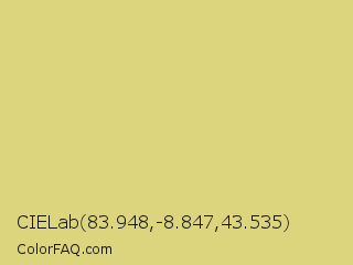 CIELab 83.948,-8.847,43.535 Color is a light yellow color and the nearest color is Chenin #dfcd6f. Hex code #ddd47e and RGB value is rgb(221,212,126). In RGB color space, this color is composed of 87% red, 83% green, 49% blue, In CMYK color space, this color is composed of 0% cyan, 4% magenta, 43% yellow , 13% black , In HSL color space, this color has a hue angle of 54° , 58% saturation and 68% lightness.