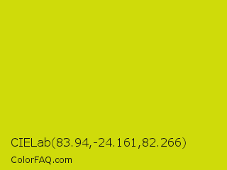 CIELab 83.94,-24.161,82.266 Color is a normal yellow color and the nearest color is Bitter Lemon #cae00d. Hex code #cfdb0a and RGB value is rgb(207,219,10). In RGB color space, this color is composed of 81% red, 86% green, 4% blue, In CMYK color space, this color is composed of 5% cyan, 0% magenta, 95% yellow , 14% black , In HSL color space, this color has a hue angle of 63° , 91% saturation and 45% lightness.