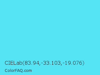 CIELab 83.94,-33.103,-19.076 Color is a light cyan color and the nearest color is Turquoise Blue #6cdae7. Hex code #55e4f4 and RGB value is rgb(85,228,244). In RGB color space, this color is composed of 33% red, 89% green, 96% blue, In CMYK color space, this color is composed of 65% cyan, 7% magenta, 0% yellow , 4% black , In HSL color space, this color has a hue angle of 186° , 88% saturation and 65% lightness.