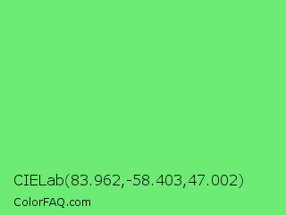 CIELab 83.962,-58.403,47.002 Color is a light green color and the nearest color is Pastel Green #77dd77. Hex code #6eeb74 and RGB value is rgb(110,235,116). In RGB color space, this color is composed of 43% red, 92% green, 45% blue, In CMYK color space, this color is composed of 53% cyan, 0% magenta, 51% yellow , 8% black , In HSL color space, this color has a hue angle of 123° , 76% saturation and 68% lightness.