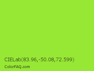 CIELab 83.96,-50.08,72.599 Color is a normal green color and the nearest color is Kiwi #8ee53f. Hex code #97e735 and RGB value is rgb(151,231,53). In RGB color space, this color is composed of 59% red, 91% green, 21% blue, In CMYK color space, this color is composed of 35% cyan, 0% magenta, 77% yellow , 9% black , In HSL color space, this color has a hue angle of 87° , 79% saturation and 56% lightness.