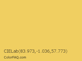 CIELab 83.973,-1.036,57.773 Color is a light yellow color and the nearest color is Cream Can #f5c85c. Hex code #f0cf61 and RGB value is rgb(240,207,97). In RGB color space, this color is composed of 94% red, 81% green, 38% blue, In CMYK color space, this color is composed of 0% cyan, 14% magenta, 60% yellow , 6% black , In HSL color space, this color has a hue angle of 46° , 83% saturation and 66% lightness.