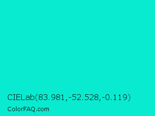 CIELab 83.981,-52.528,-0.119 Color is a normal cyan color and the nearest color is Bright Turquoise #08e8de. Hex code #09ebd0 and RGB value is rgb(9,235,208). In RGB color space, this color is composed of 4% red, 92% green, 82% blue, In CMYK color space, this color is composed of 96% cyan, 0% magenta, 11% yellow , 8% black , In HSL color space, this color has a hue angle of 173° , 93% saturation and 48% lightness.