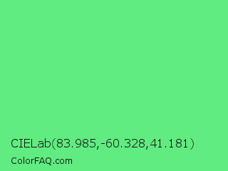 CIELab 83.985,-60.328,41.181 Color is a light green color and the nearest color is Very Light Malachite Green #64e986. Hex code #60ec80 and RGB value is rgb(96,236,128). In RGB color space, this color is composed of 38% red, 93% green, 50% blue, In CMYK color space, this color is composed of 59% cyan, 0% magenta, 46% yellow , 7% black , In HSL color space, this color has a hue angle of 134° , 79% saturation and 65% lightness.