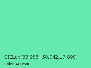 CIELab 83.988,-50.042,17.898 Color is a light green color and the nearest color is Medium Aquamarine #66ddaa. Hex code #64e9ae and RGB value is rgb(100,233,174). In RGB color space, this color is composed of 39% red, 91% green, 68% blue, In CMYK color space, this color is composed of 57% cyan, 0% magenta, 25% yellow , 9% black , In HSL color space, this color has a hue angle of 153° , 75% saturation and 65% lightness.