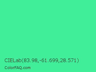 CIELab 83.98,-61.699,28.571 Color is a normal green color and the nearest color is Eucalyptus #44d7a8. Hex code #42ed99 and RGB value is rgb(66,237,153). In RGB color space, this color is composed of 26% red, 93% green, 60% blue, In CMYK color space, this color is composed of 72% cyan, 0% magenta, 35% yellow , 7% black , In HSL color space, this color has a hue angle of 151° , 83% saturation and 59% lightness.