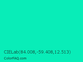 CIELab 84.008,-59.408,12.513 Color is a normal cyan color and the nearest color is Medium Spring Green #00fa9a. Hex code #08edb8 and RGB value is rgb(8,237,184). In RGB color space, this color is composed of 3% red, 93% green, 72% blue, In CMYK color space, this color is composed of 97% cyan, 0% magenta, 22% yellow , 7% black , In HSL color space, this color has a hue angle of 166° , 93% saturation and 48% lightness.