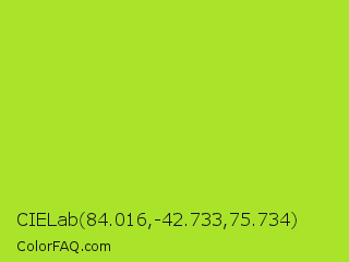 CIELab 84.016,-42.733,75.734 Color is a normal lime color and the nearest color is Green Lizard #a7f432. Hex code #a9e42b and RGB value is rgb(169,228,43). In RGB color space, this color is composed of 66% red, 89% green, 17% blue, In CMYK color space, this color is composed of 26% cyan, 0% magenta, 81% yellow , 11% black , In HSL color space, this color has a hue angle of 79° , 77% saturation and 53% lightness.
