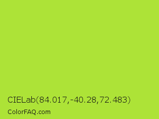 CIELab 84.017,-40.28,72.483 Color is a normal lime color and the nearest color is Green Lizard #a7f432. Hex code #ade337 and RGB value is rgb(173,227,55). In RGB color space, this color is composed of 68% red, 89% green, 22% blue, In CMYK color space, this color is composed of 24% cyan, 0% magenta, 76% yellow , 11% black , In HSL color space, this color has a hue angle of 79° , 75% saturation and 55% lightness.