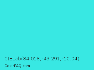 CIELab 84.018,-43.291,-10.04 Color is a normal cyan color and the nearest color is Turquoise #40e0d0. Hex code #38e8e3 and RGB value is rgb(56,232,227). In RGB color space, this color is composed of 22% red, 91% green, 89% blue, In CMYK color space, this color is composed of 76% cyan, 0% magenta, 2% yellow , 9% black , In HSL color space, this color has a hue angle of 178° , 79% saturation and 56% lightness.