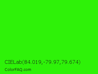 CIELab 84.019,-79.97,79.674 Color is a normal green color and the nearest color is Neon Green #39ff14. Hex code #2ef208 and RGB value is rgb(46,242,8). In RGB color space, this color is composed of 18% red, 95% green, 3% blue, In CMYK color space, this color is composed of 81% cyan, 0% magenta, 97% yellow , 5% black , In HSL color space, this color has a hue angle of 110° , 94% saturation and 49% lightness.