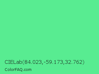 CIELab 84.023,-59.173,32.762 Color is a light green color and the nearest color is Very Light Malachite Green #64e986. Hex code #58ec91 and RGB value is rgb(88,236,145). In RGB color space, this color is composed of 35% red, 93% green, 57% blue, In CMYK color space, this color is composed of 63% cyan, 0% magenta, 39% yellow , 7% black , In HSL color space, this color has a hue angle of 143° , 80% saturation and 64% lightness.