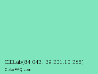 CIELab 84.043,-39.201,10.258 Color is a light green color and the nearest color is Bermuda #7dd8c6. Hex code #7ee5bd and RGB value is rgb(126,229,189). In RGB color space, this color is composed of 49% red, 90% green, 74% blue, In CMYK color space, this color is composed of 45% cyan, 0% magenta, 17% yellow , 10% black , In HSL color space, this color has a hue angle of 157° , 66% saturation and 70% lightness.
