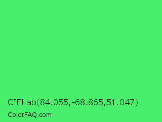 CIELab 84.055,-68.865,51.047 Color is a light green color and the nearest color is UFO Green #3cd070. Hex code #48ef6b and RGB value is rgb(72,239,107). In RGB color space, this color is composed of 28% red, 94% green, 42% blue, In CMYK color space, this color is composed of 70% cyan, 0% magenta, 55% yellow , 6% black , In HSL color space, this color has a hue angle of 133° , 84% saturation and 61% lightness.