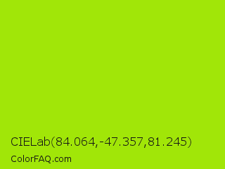CIELab 84.064,-47.357,81.245 Color is a normal lime color and the nearest color is Vivid Lime Green #a6d608. Hex code #a1e608 and RGB value is rgb(161,230,8). In RGB color space, this color is composed of 63% red, 90% green, 3% blue, In CMYK color space, this color is composed of 30% cyan, 0% magenta, 97% yellow , 10% black , In HSL color space, this color has a hue angle of 79° , 93% saturation and 47% lightness.