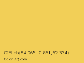 CIELab 84.065,-0.851,62.334 Color is a light yellow color and the nearest color is Cream Can #f5c85c. Hex code #f2cf57 and RGB value is rgb(242,207,87). In RGB color space, this color is composed of 95% red, 81% green, 34% blue, In CMYK color space, this color is composed of 0% cyan, 14% magenta, 64% yellow , 5% black , In HSL color space, this color has a hue angle of 46° , 86% saturation and 65% lightness.