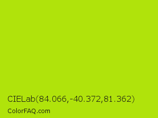 CIELab 84.066,-40.372,81.362 Color is a normal lime color and the nearest color is Inch Worm #b0e313. Hex code #b0e30b and RGB value is rgb(176,227,11). In RGB color space, this color is composed of 69% red, 89% green, 4% blue, In CMYK color space, this color is composed of 22% cyan, 0% magenta, 95% yellow , 11% black , In HSL color space, this color has a hue angle of 74° , 91% saturation and 47% lightness.