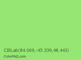 CIELab 84.069,-45.339,48.443 Color is a light green color and the nearest color is Feijoa #9fdd8c. Hex code #95e672 and RGB value is rgb(149,230,114). In RGB color space, this color is composed of 58% red, 90% green, 45% blue, In CMYK color space, this color is composed of 35% cyan, 0% magenta, 50% yellow , 10% black , In HSL color space, this color has a hue angle of 102° , 70% saturation and 67% lightness.