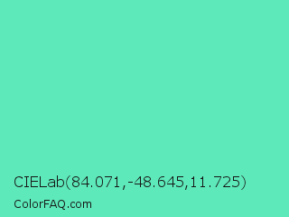 CIELab 84.071,-48.645,11.725 Color is a light green color and the nearest color is Medium Aquamarine #66ddaa. Hex code #5ee9ba and RGB value is rgb(94,233,186). In RGB color space, this color is composed of 37% red, 91% green, 73% blue, In CMYK color space, this color is composed of 60% cyan, 0% magenta, 20% yellow , 9% black , In HSL color space, this color has a hue angle of 160° , 76% saturation and 64% lightness.