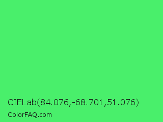 CIELab 84.076,-68.701,51.076 Color is a light green color and the nearest color is Screamin Green #66ff66. Hex code #49ef6b and RGB value is rgb(73,239,107). In RGB color space, this color is composed of 29% red, 94% green, 42% blue, In CMYK color space, this color is composed of 69% cyan, 0% magenta, 55% yellow , 6% black , In HSL color space, this color has a hue angle of 132° , 84% saturation and 61% lightness.