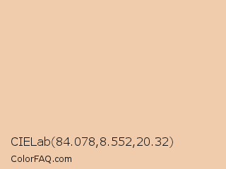 CIELab 84.078,8.552,20.32 Color is a very light orange color and the nearest color is Pancho #edcdab. Hex code #f0cbac and RGB value is rgb(240,203,172). In RGB color space, this color is composed of 94% red, 80% green, 67% blue, In CMYK color space, this color is composed of 0% cyan, 15% magenta, 28% yellow , 6% black , In HSL color space, this color has a hue angle of 27° , 69% saturation and 81% lightness.