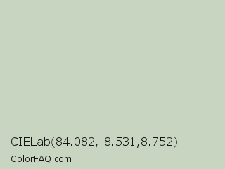 CIELab 84.082,-8.531,8.752 Color is a light green color and the nearest color is Pastel Gray #cfcfc4. Hex code #c8d6c1 and RGB value is rgb(200,214,193). In RGB color space, this color is composed of 78% red, 84% green, 76% blue, In CMYK color space, this color is composed of 7% cyan, 0% magenta, 10% yellow , 16% black , In HSL color space, this color has a hue angle of 100° , 20% saturation and 80% lightness.