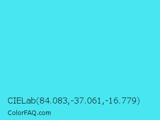 CIELab 84.083,-37.061,-16.779 Color is a light cyan color and the nearest color is Turquoise #40e0d0. Hex code #47e6f0 and RGB value is rgb(71,230,240). In RGB color space, this color is composed of 28% red, 90% green, 94% blue, In CMYK color space, this color is composed of 70% cyan, 4% magenta, 0% yellow , 6% black , In HSL color space, this color has a hue angle of 184° , 85% saturation and 61% lightness.