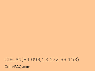 CIELab 84.093,13.572,33.153 Color is a light orange color and the nearest color is Peach Orange #ffcc99. Hex code #ffc794 and RGB value is rgb(255,199,148). In RGB color space, this color is composed of 100% red, 78% green, 58% blue, In CMYK color space, this color is composed of 0% cyan, 22% magenta, 42% yellow , 0% black , In HSL color space, this color has a hue angle of 29° , 100% saturation and 79% lightness.