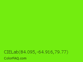 CIELab 84.095,-64.916,79.77 Color is a normal green color and the nearest color is Lawn Green #7cfc00. Hex code #73ed0f and RGB value is rgb(115,237,15). In RGB color space, this color is composed of 45% red, 93% green, 6% blue, In CMYK color space, this color is composed of 51% cyan, 0% magenta, 94% yellow , 7% black , In HSL color space, this color has a hue angle of 93° , 88% saturation and 49% lightness.