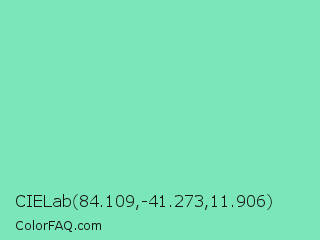 CIELab 84.109,-41.273,11.906 Color is a light green color and the nearest color is Bermuda #7dd8c6. Hex code #7ae6ba and RGB value is rgb(122,230,186). In RGB color space, this color is composed of 48% red, 90% green, 73% blue, In CMYK color space, this color is composed of 47% cyan, 0% magenta, 19% yellow , 10% black , In HSL color space, this color has a hue angle of 156° , 68% saturation and 69% lightness.