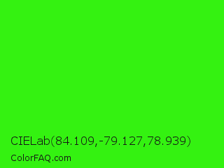 CIELab 84.109,-79.127,78.939 Color is a normal green color and the nearest color is Neon Green #39ff14. Hex code #34f211 and RGB value is rgb(52,242,17). In RGB color space, this color is composed of 20% red, 95% green, 7% blue, In CMYK color space, this color is composed of 79% cyan, 0% magenta, 93% yellow , 5% black , In HSL color space, this color has a hue angle of 111° , 90% saturation and 51% lightness.