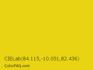 CIELab 84.115,-10.051,82.436 Color is a normal yellow color and the nearest color is Citrine #e4d00a. Hex code #e8d412 and RGB value is rgb(232,212,18). In RGB color space, this color is composed of 91% red, 83% green, 7% blue, In CMYK color space, this color is composed of 0% cyan, 9% magenta, 92% yellow , 9% black , In HSL color space, this color has a hue angle of 54° , 86% saturation and 49% lightness.