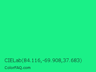 CIELab 84.116,-69.908,37.683 Color is a normal green color and the nearest color is Spring Green #00ff7f. Hex code #1af087 and RGB value is rgb(26,240,135). In RGB color space, this color is composed of 10% red, 94% green, 53% blue, In CMYK color space, this color is composed of 89% cyan, 0% magenta, 44% yellow , 6% black , In HSL color space, this color has a hue angle of 151° , 88% saturation and 52% lightness.
